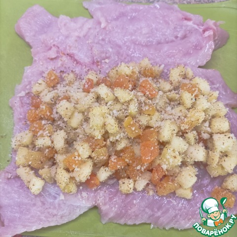 Острым ножом сделать глубокий продольный разрез филе индейки, не доходя до края примерно 2 см. Развернуть филе и слегка отбить. Выложить начинку.