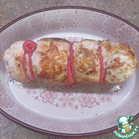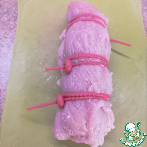 Завернуть мякотью индейки. Края закрепить деревянными шпажками, а рулет перевязать. Натереть солью и перцем.