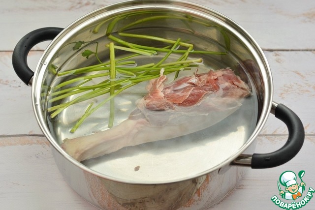 Кастрюля должна быть довольно вместительной, у меня 5-литровая кастрюля. Баранью голяшку сполосните и залейте водой. Добавьте стебли петрушки и доведите до кипения. Первые 5 минут пусть баранина кипит на сильном огне. В это время выделяется пена, которую нужно тщательно снять ложкой. Затем убавьте огонь и варите баранину при тихом кипении примерно 2 часа. Это минимально, возможно и дольше. От голяшки мясо должно легко отходить. В процессе варки добавьте в бульон соль по вкусу.