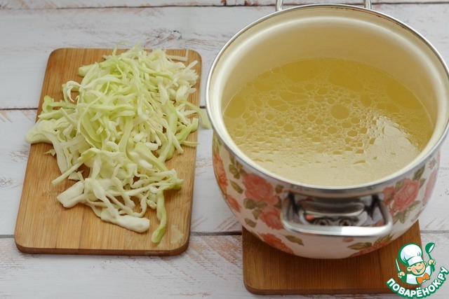 Нашинкуйте соломкой капусту. Доведите до кипения бульон из баранины и положите в него капусту, варите примерно 15-20 минут на среднем огне.