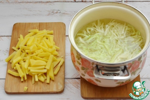 Нашинкуйте соломкой картошку и добавьте её в кастрюлю к капусте, продолжайте варить ещё примерно 15-20 минут.