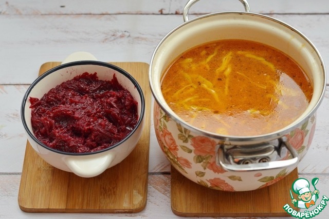 Печёную (варёную) свеклу натрите на крупной тёрке и добавьте в борщ в последнюю очередь. Как только борщ со свеклой закипит, выключите плиту.