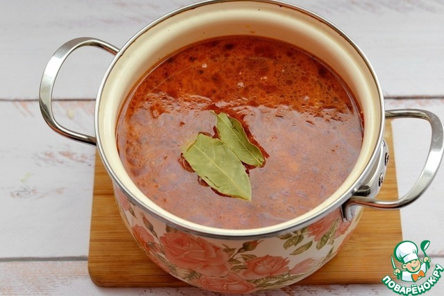 По желанию можете добавить в борщ с бараниной любые специи, я же ограничусь парочкой лавровых листов, потому что использовала насыщенный по вкусу и аромату Краснодарский соус.