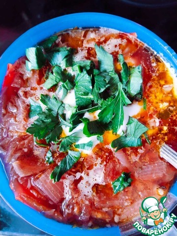 Затем добавьте в борщ зажарку из лука, моркови и томатного соуса. Варите всё вместе около 10 минут.