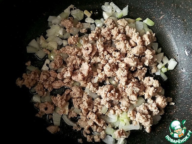 На сковороду наливаем масло, греем его и выкладываем чеснок, обжариваем с минуту, чтобы чеснок отдал свой аромат маслу. Выкладываем лук, золотим его до мягкости. Очередь фарша. Обжариваем всё немного.