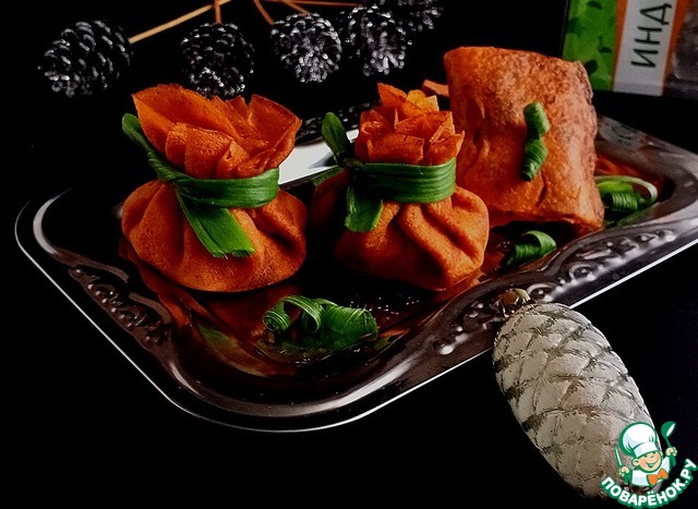Предлагаю вам острую закуску из томатных блинчиков с начинкой из фарша индейки с перцем-чили и рисом. Такая закуска в виде мешочков Деда Мороза украсит ваш новогодний стол.