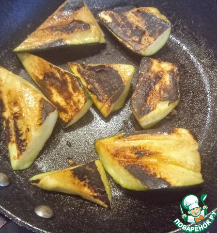 На раскаленной сковороде жарить цуккини на плоской стороне, прижимая их к дну сковороды 3 минуты до образования небольших знаков обугливания. Готовить 5 минут на другой стороне. Затем