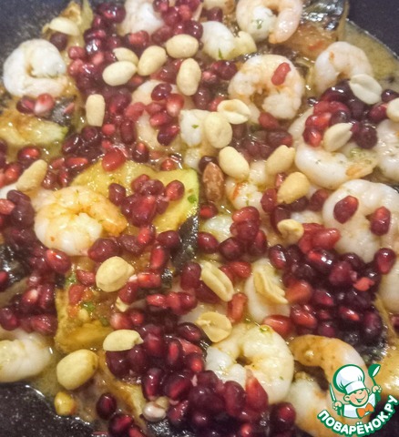Выложить цуккини на большую тарелку, добавить креветки. Вылить оставшуюся заправку. Посыпать семенами граната и арахисом. Приятного аппетита.