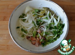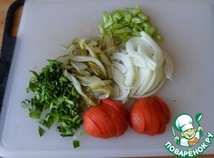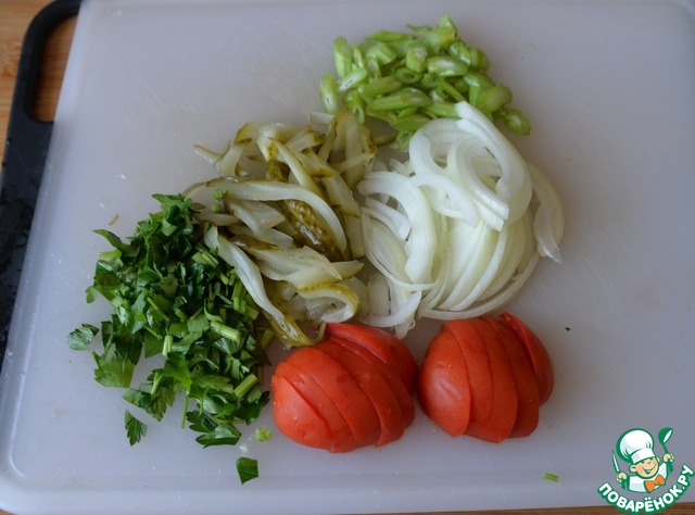 Лук чистим, режем тонкими стрелками, маринованный огурец тонкими полосками. Черешковый сельдерей полосками или полумесяцами. Помидор режем дольками. Измельчаем зелень.