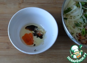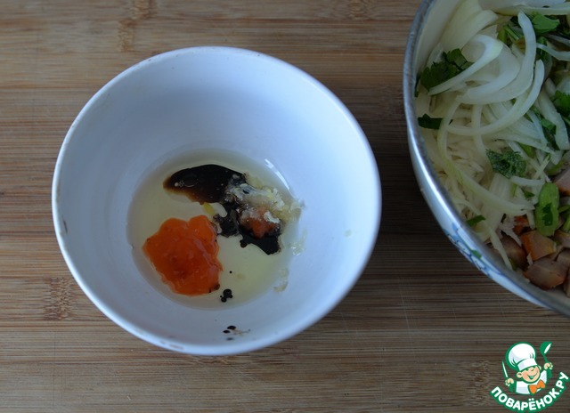 Делаем заправку. Соединяем растительное масло, бальзамик, гранатовый сироп и сладкий соус чили, выдавливаем чеснок. В заправке совсем не обязательно применять все перечисленные составляющие, главное - получить кисло-сладко-острый вкус с ароматом чеснока. Добиться этого можно, добавив к маслу сок лимона, красный молотый перец, чеснок. А сладость можно получить, добавив сахар.