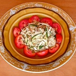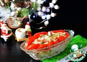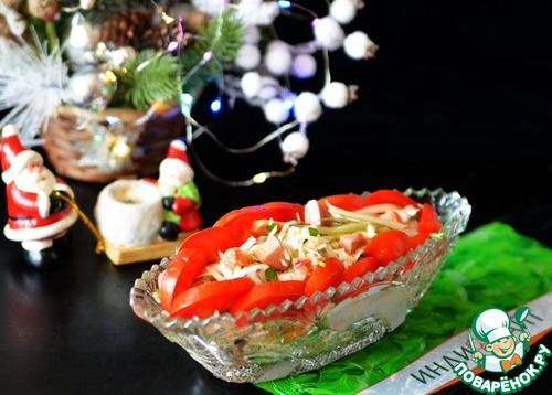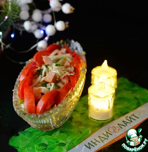 Салат подаём охлаждённым. При подаче сверху кладём дольки помидоров. Приятного аппетита!