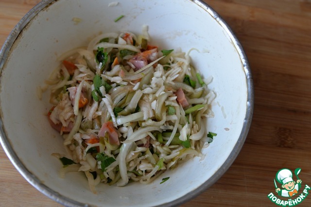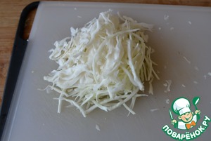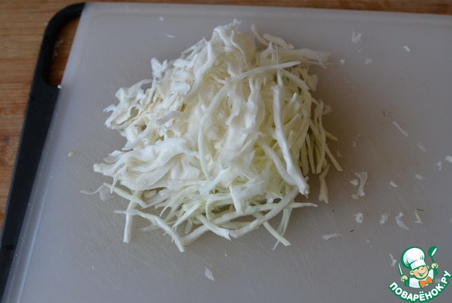 Капусту шинкуем тонкими полосками, слегка посыпаем солью, обминаем.