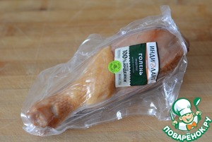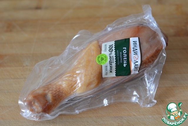 Для приготовления салата берём варено-копчёную голень индейки. У меня ТМ Индилайт.