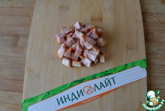 Отделяем филе индейки от кости и нарезаем мелкими кубиками.