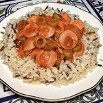 Сосиски освободите от оболочки, нарежьте кружочками. Также кружочками нарежьте оливки.