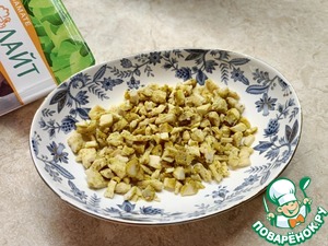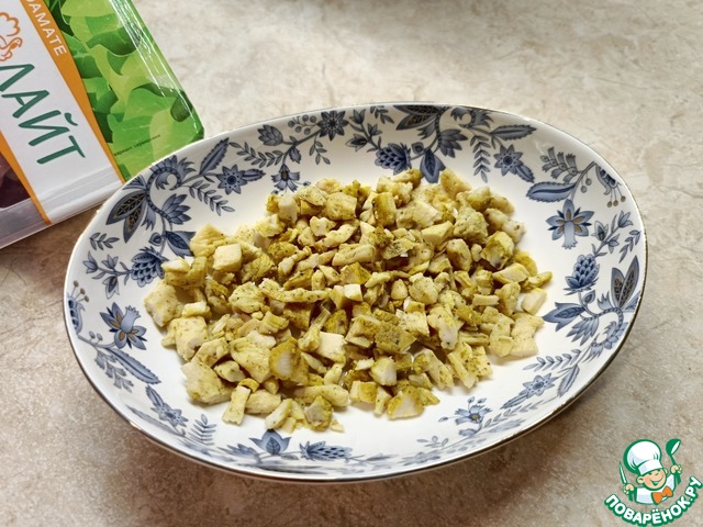 Кусочки индейки приправить карри, солью, перцем и обжарить на сковороде. Когда кусочки остынут, нарезать из маленькими кубиками.