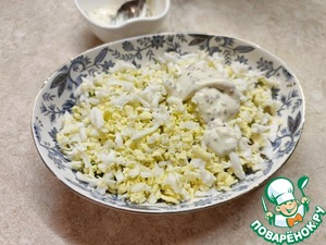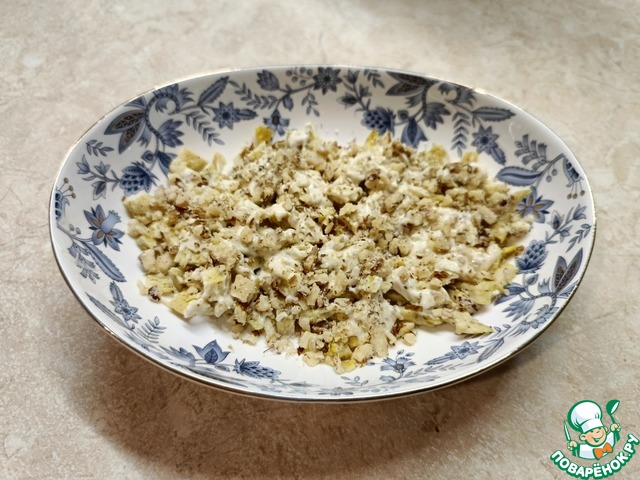 3 слой - вареные яйца, натертые на терке. Смазать майонезной заправкой. Посыпать орехами.