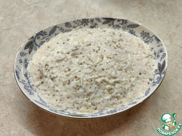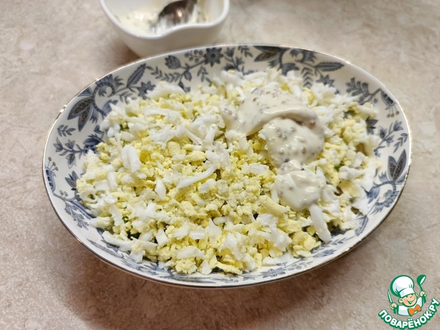 Для заправки салата смешать майонез с зерновой горчицей и сухим чесноком. -