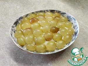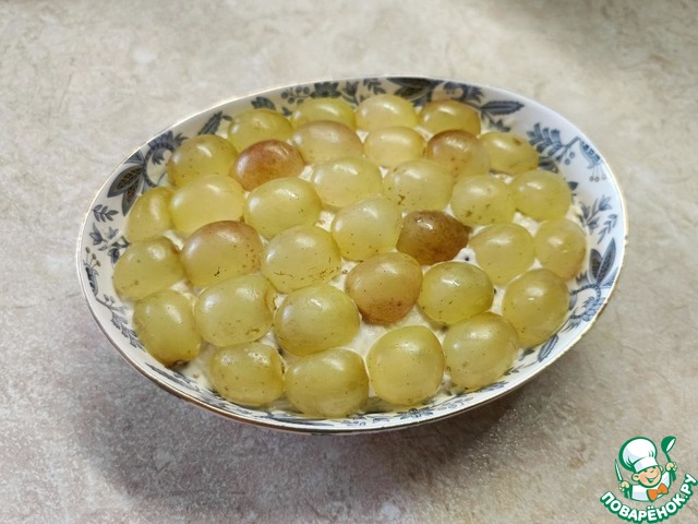 Виноград разрезать пополам и разложить по поверхности салата. Удобнее взять виноград без косточек. Или придётся повозится и удалить их.