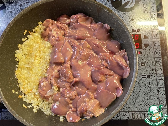 Репчатую луковицу обжарьте на растительном масле и затем добавьте индюшиную печень ТМ "Индилайт". Все обжарьте до готовности печени.