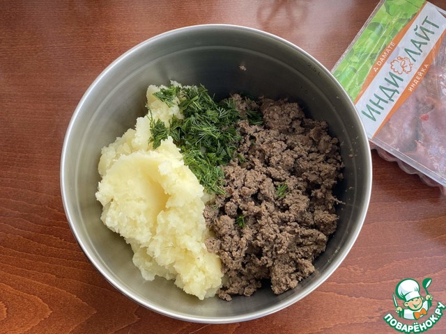 Картофель отварите до готовности, пюрируйте и смешайте с печенью и измельченным укропом. Посолите и поперчите по вкусу.