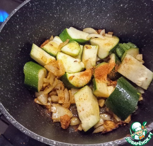 На сковороде на очень сильном огне разогреть масло и добавить зиру, листья карри и горчицу. Готовить 30 секунд. Затем добавить лук, чеснок, цуккини и перец чили. Жарить 2 минуты, постоянно помешивая. Добавить куркуму, соль и перец. Продолжать готовить ещё 4 минуты.
