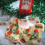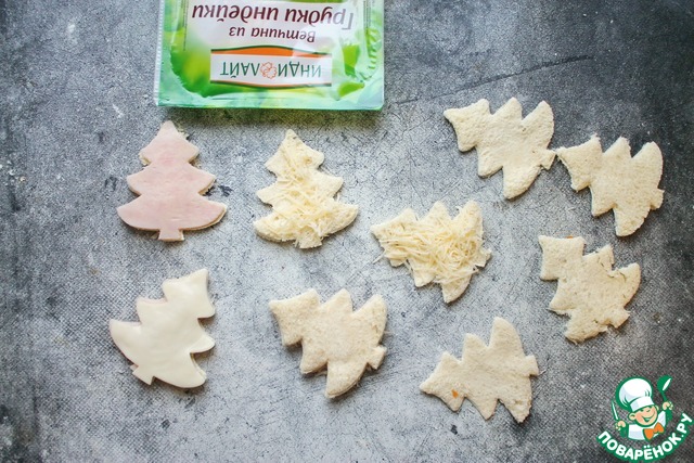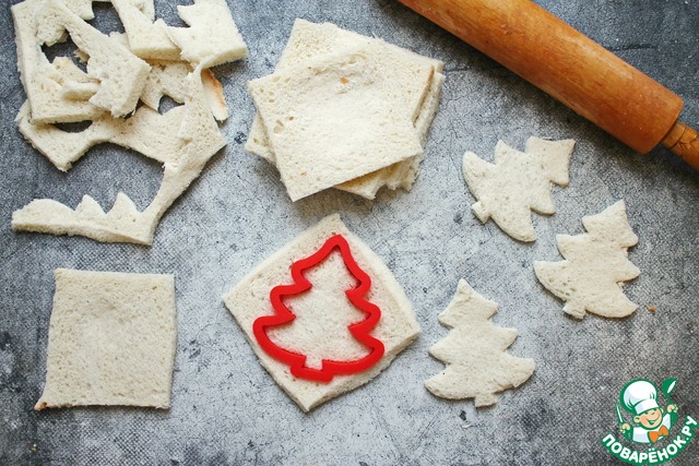 У тостового, белого хлеба срежьте корки и немного раскатайте скалкой. Формочкой вырежьте елочки. На каждый бутерброд нам понадобится две заготовки.
