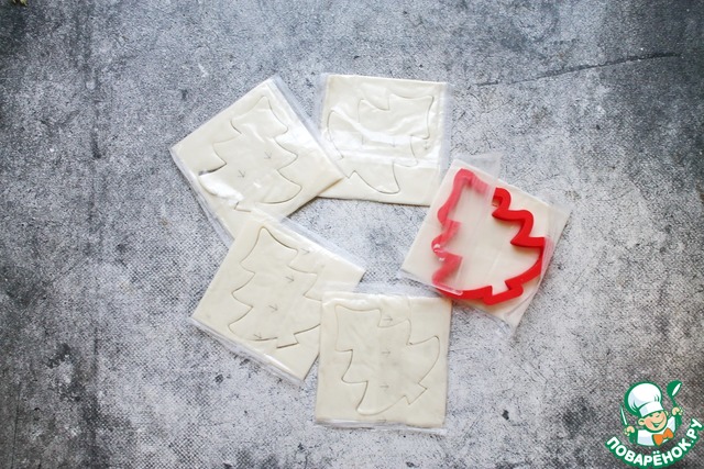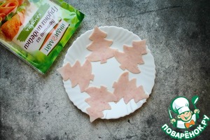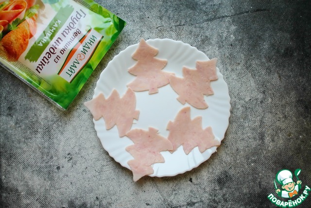 Из ветчины, у меня ветчина из грудки индейки "Индилайт", сложенную в два слоя, вырежьте формочкой елочки.