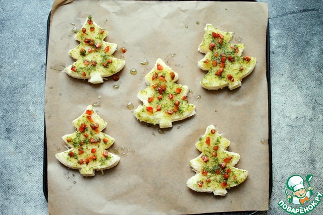 Разложите елочки на противне с пергаментом. Укроп мелко порубите, смешайте с тертым сыром и растительным маслом. Укроп можно заменить на петрушку или другой зеленью. Нанесите массу на поверхность елочек. Красный перец мелко порежьте и посыпьте елочки, они будут играть роль игрушек или фонариков. Поставьте противень в горячую духовку и запекайте при температуре 180 градусов около 10 минут. Подавайте горячие бутерброды сразу.
