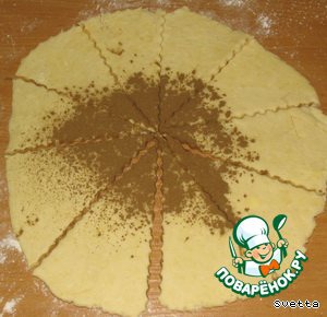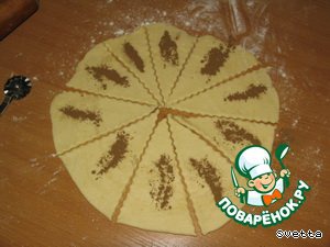 В центр блина насыпать корицу (можно вместо корицы добавлять мак). Блин разрезать по диаметру на 8-12 частей.