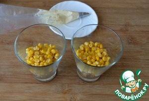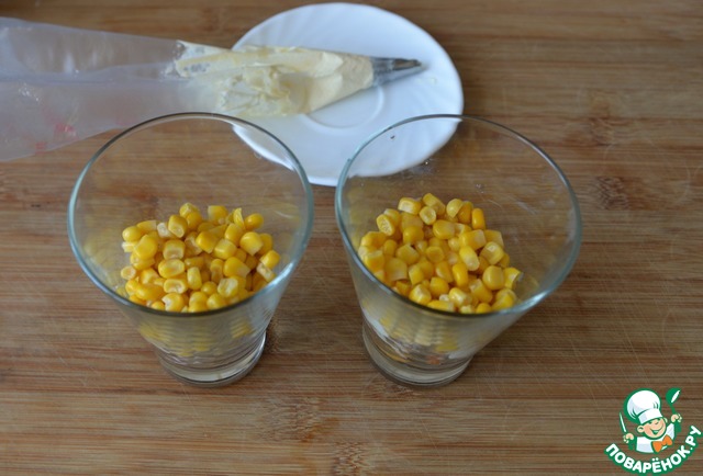 Следующим слоем кладём по полной столовой ложке кукурузы, наносим слой майонеза.