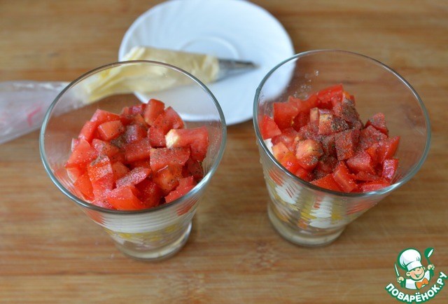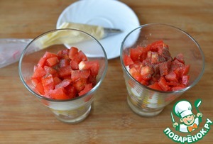 Помидоры режем кубиками. Если они слишком сочные внутри, то срезаем мякоть. Кладём порезанные помидоры сверху кукурузы, слегка солим, перчим, наносим слой майонеза с чесноком.