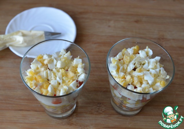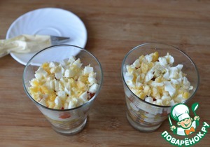 Следующим слоем кладём порезанные или тёртые вареные яйца, смазываем майонезом с чесноком.