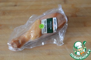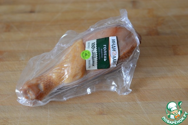 Для приготовления салата берём варено-копчёную голень индейки. У меня ТМ Индилайт.