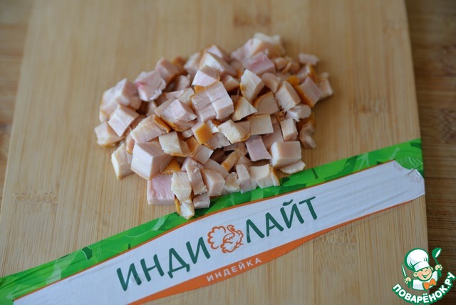 Отделяем филе индейки от кости и нарезаем мелкими кубиками.
