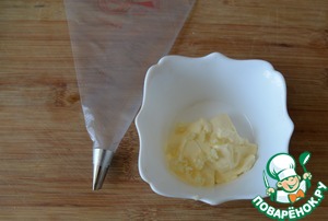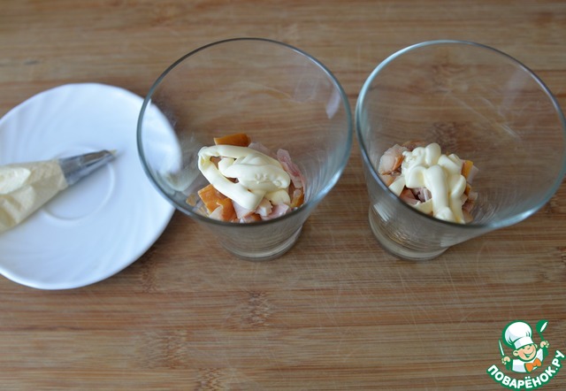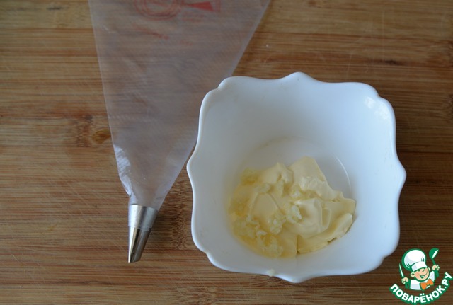 К майонезу добавляем выдавленный чеснок, перемешиваем. Для удобства приготовления салата, перекладываем майонез с чесноком в кулинарный мешок с мелкой или узкой насадкой.