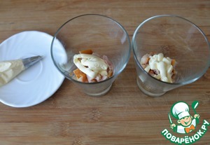 Для оформления салата берём бокалы (стаканы или креманницы). На дно кладём порезанное копчёное филе индейки, наносим слой майонеза.