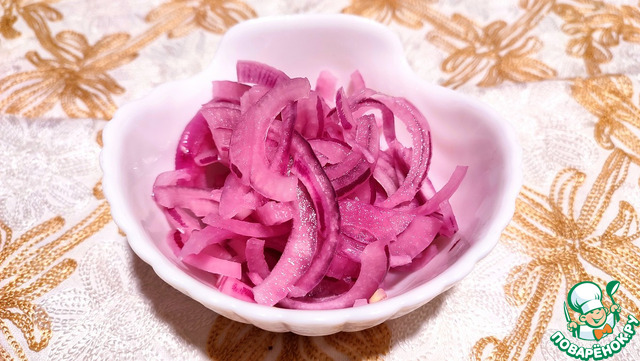 Лук нарезать полукольцами или перьями. Красный или белый не принципиально, но красный выглядит аппетитнее.