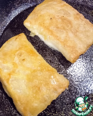 В сковороде на среднем огне разогреть 1 столовую ложку масла ( как можно горячее!) и жарить слойки по 2-3 минуты с каждой стороны до золотистого цвета. Можно подавать. Приятного аппетита.