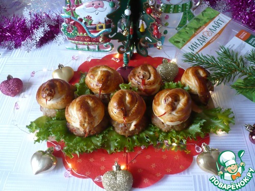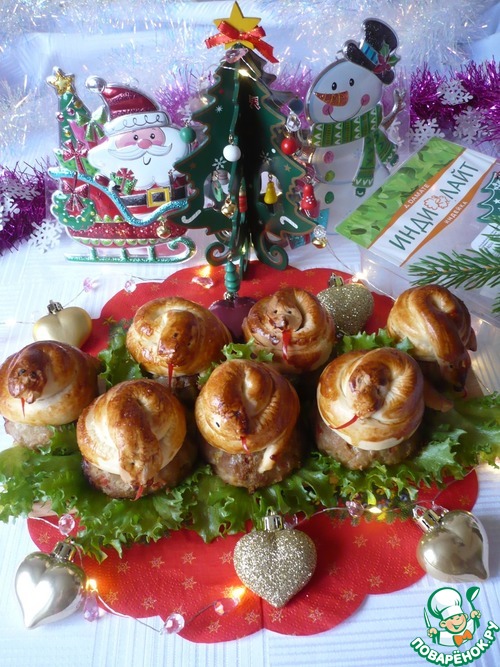 Скатайте тесто в жгутики. Один конец каждого жгутика сделайте более узким - это будет хвост. Теперь на фаршированную котлету аккуратно выкладываем "змейку", другой конец жгутика прижимаем с двух сторон - это будет голова, чтобы сделать "глазки" я взяла черный кунжут, смазать "змеек" яйцом. Верните форму обратно в духовку еще на 15 минут (время указано приблизительно, ориентируйтесь на особенности работы вашей техники).