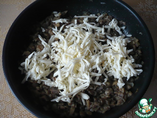 Когда шампиньоны будут готовы, добавьте натертый на крупной терке плавленный сырок. Все хорошо перемешайте.