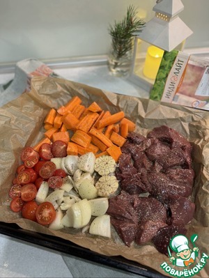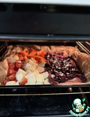 • Печень и произвольно нарезанные овощи выложить на застеленный пергаментом противень. Сверху посолить, поперчить, добавить любимые специи, сбрызнуть оливковым маслом