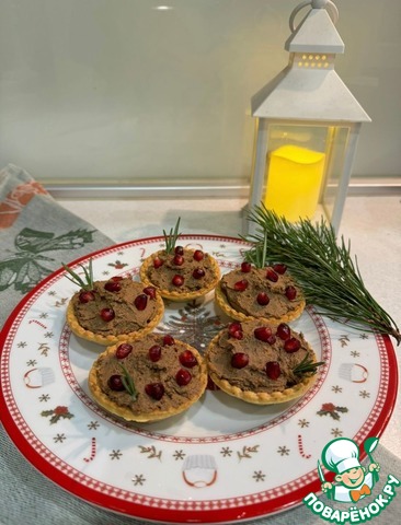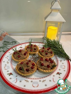 • Начиняем тарталетки паштетом, сверху украшаем зернами граната, веточками розмарина и подаем к столу. Всем приятного аппетита!