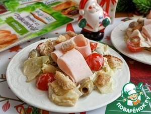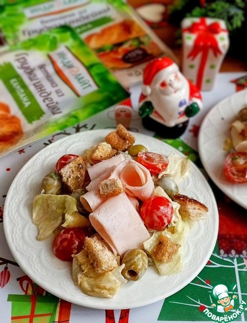 Хрустящие листья салата"Айсберг", вкус ветчины из индейки, пряные сухарики и пикантная заправка. Такой салат порадует вас в новогодние праздники. Угостить гостей и удивить их, подав салат в качестве закуски - то, что нужно нам в новогоднем домашнем меню.