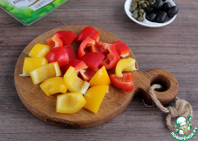 • Красный и желтый перец очистите и нарежьте крупными кусочками.
