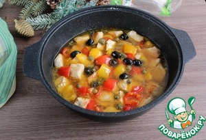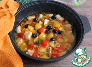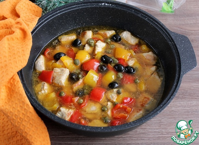 Тушите на слабом огне, пока мясо не станет мягким, в конце приготовления добавьте маслины и каперсы и готовьте еще 5 минут.
