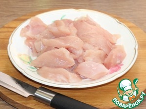 • 2. Промойте и обсушите индейку бумажным полотенцем и нарежьте филе небольшими кусочками, толщиной 1,5 - 2 см.
