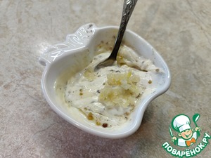 Сначала приготовить заправку для салата. Смешать майонез и сметану. Добавить горчицу и сок лимона.