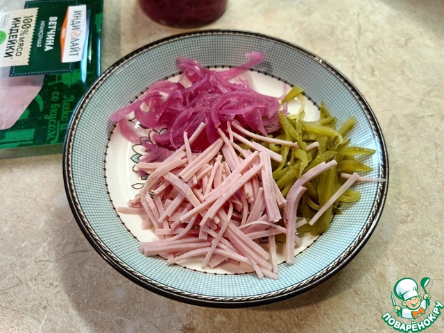 Нарезать соломкой маринованный огурец. Нарезать полукольцами лук. Если лук острый, то его лучше промыть водой.