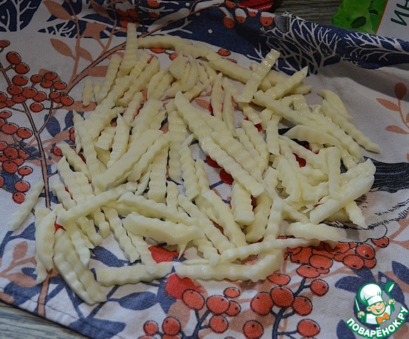 Обжарить в растительном масле, удобнее это сделать в два- три раза. Готовый картофель выложить на бумажное полотенце для удаления лишнего масла.